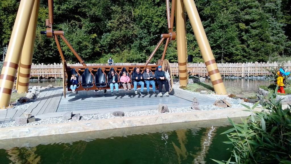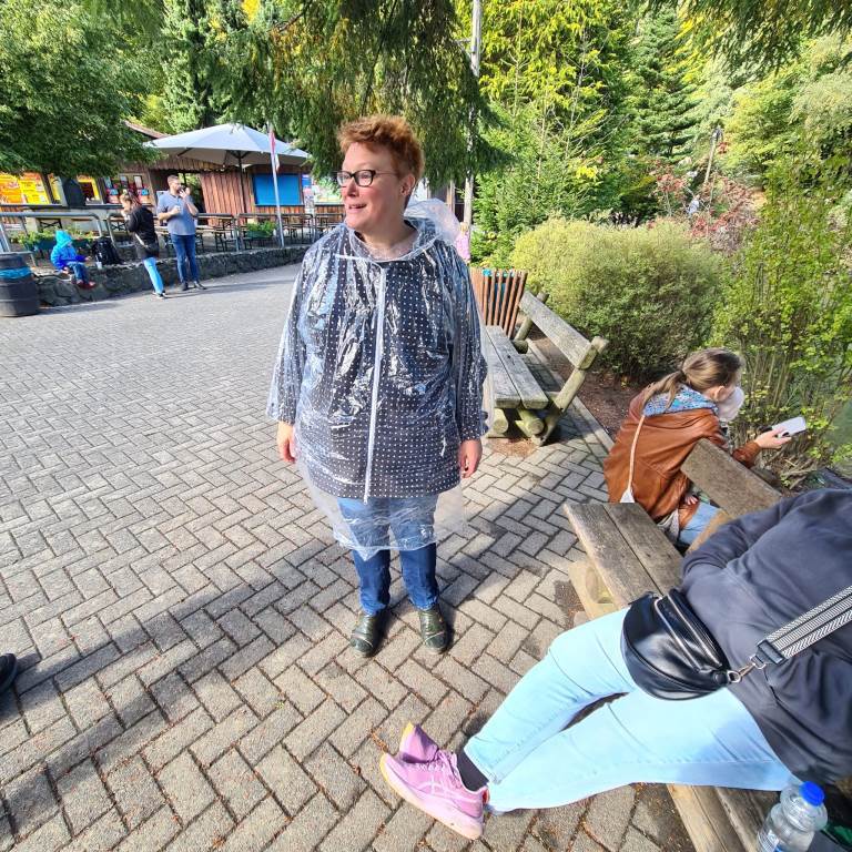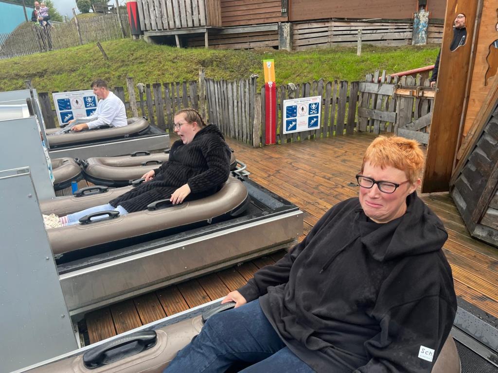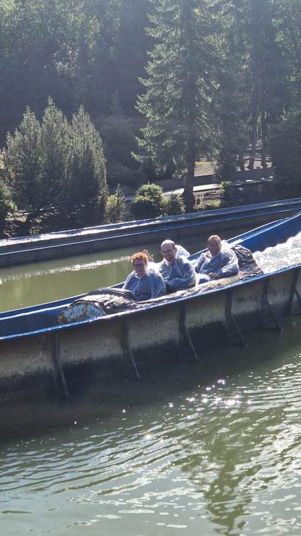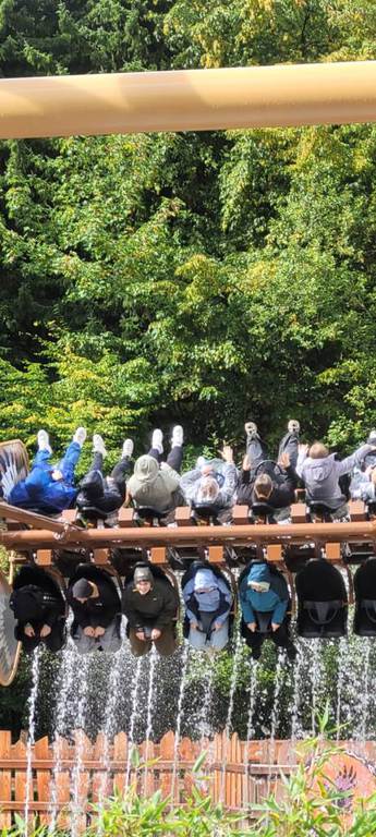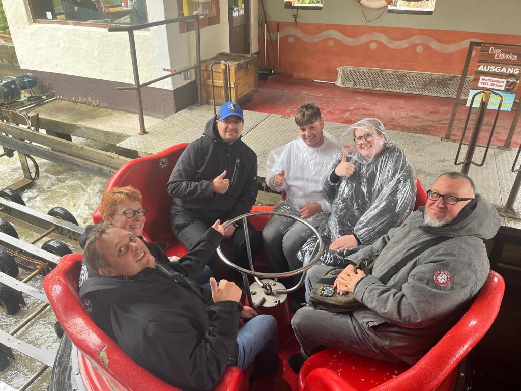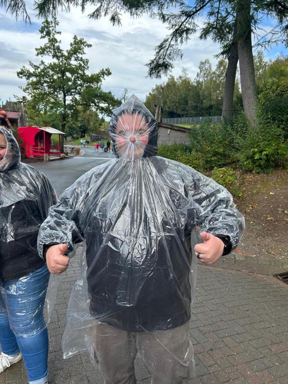 Ein besonderes Highlight war die Fahrt auf der Wasserbahn Los Rapidos während die Betreuer schreiend im strömenden Regen durch die Stromschnellen sausten und Jessica trotz Gummistiefeln das Wasser hinein lief.